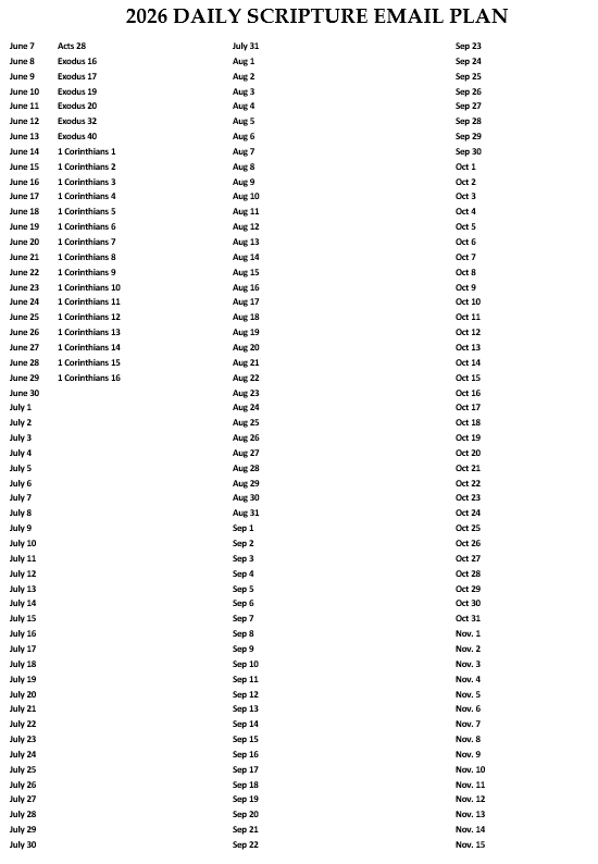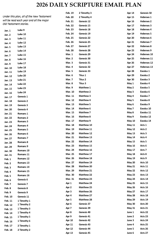 Daily Scripture and Prayers Schedule Daily Scripture Readings Schedule for 2026 EmailsThe rest of the year is coming. Iām still working on it.